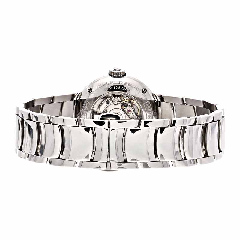 Rundes Gehäuse poliertem Edelstahl, Gehäuseboden mit Sichtfenster, 4-fach verschraubt. Gehäusedurchmesser 30 x 10mm, Kratzfestes Saphirglas, 50 Meter Wasserdicht.