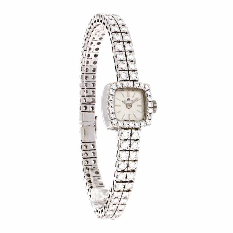 Gesamtlänge der Uhr 17,5cm, Insgesamt 124 Brillanten mit 8,172 ct W/If in Gehäuse und Band verarbeitet