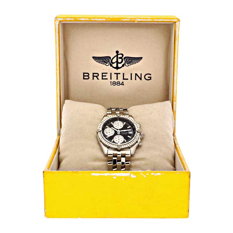 Mechanisches Uhrwerk mit automatischem Aufzug (Automatik) Breitling Kaliber B13 (ETA 7750 ) mit 25 Lagersteinen und 28.800 A/h. Gangreserve ca. 42 Stunden. Anzeige für Stunden, Minuten und Sekunden. Stoppfunktion bis zu 12Std. Datumsanzeige mit automatischem Datumswechsel und Schnellkorrektur. Sekundenstopp zur exakten Zeiteinstellung.