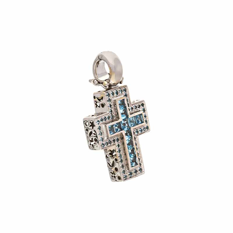 Prächtiger Anhänger 'Kreuz' aus 750er Weißgold mit Topase und einem Spinell.