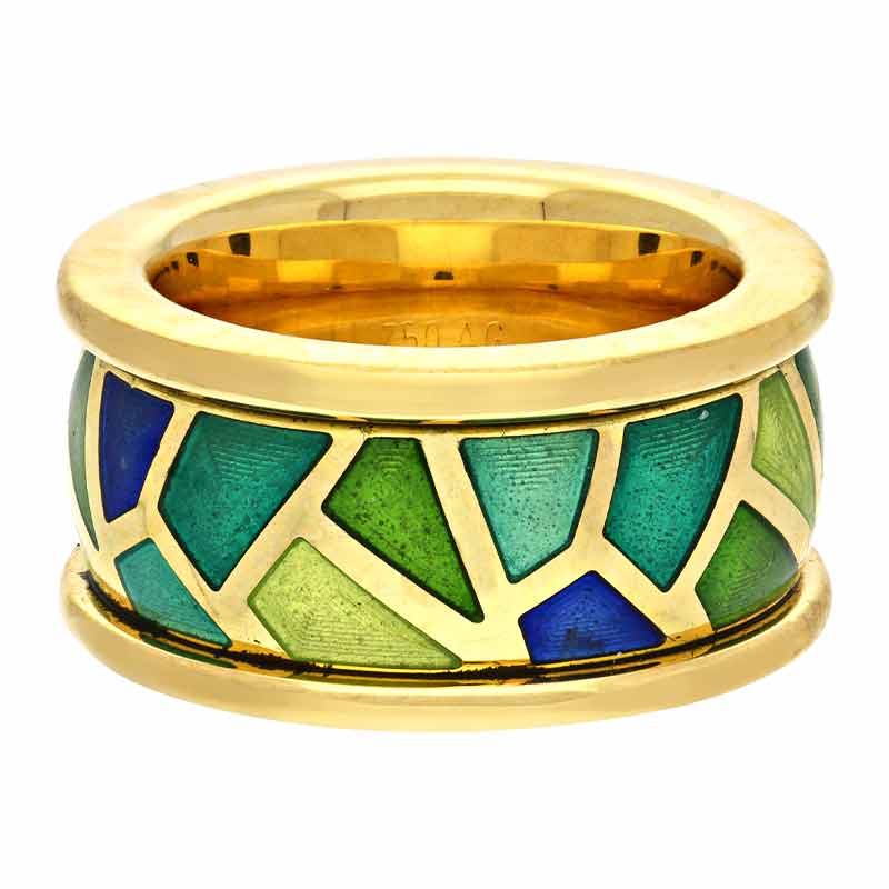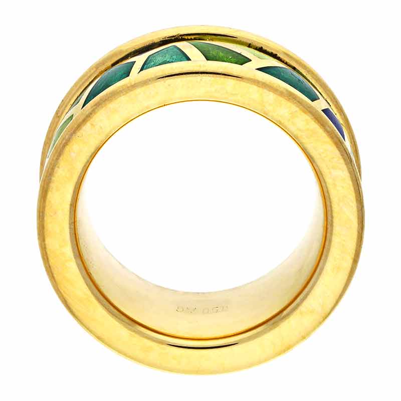 Außergewöhnlicher Drehring aus 750er Gelbgold mit Emaille.