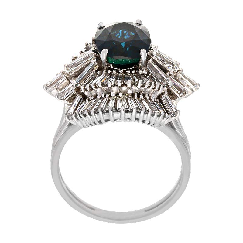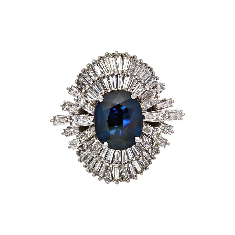 Exklusiver Damenring aus 750er Weißgold mit einem Safir und glitzernden Trapez-Diamanten. Ein unabhängiges ist im Lieferumfang enthalten.