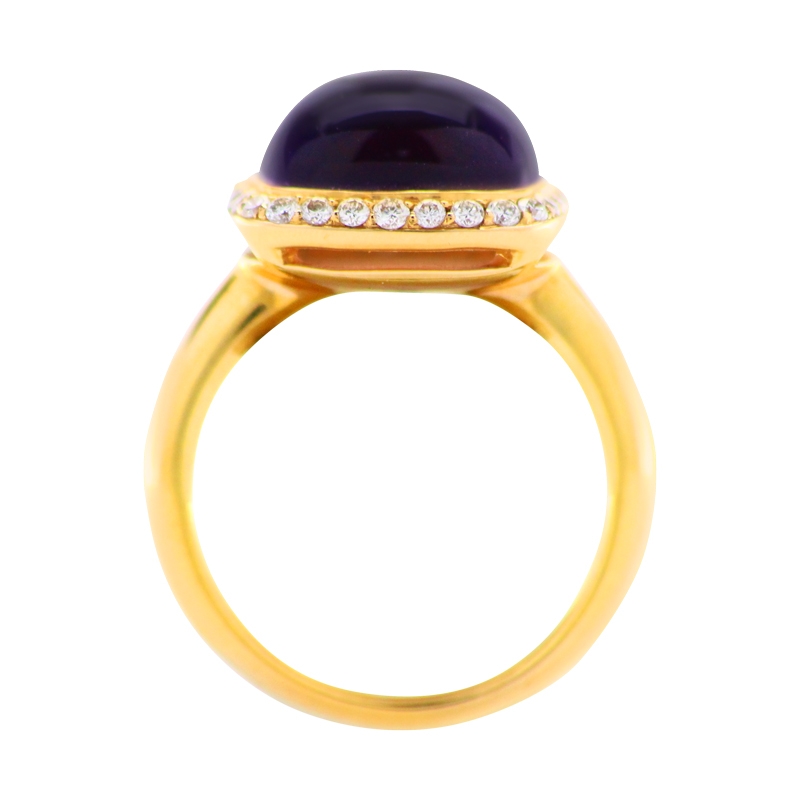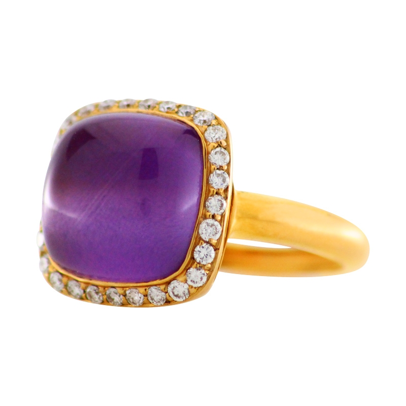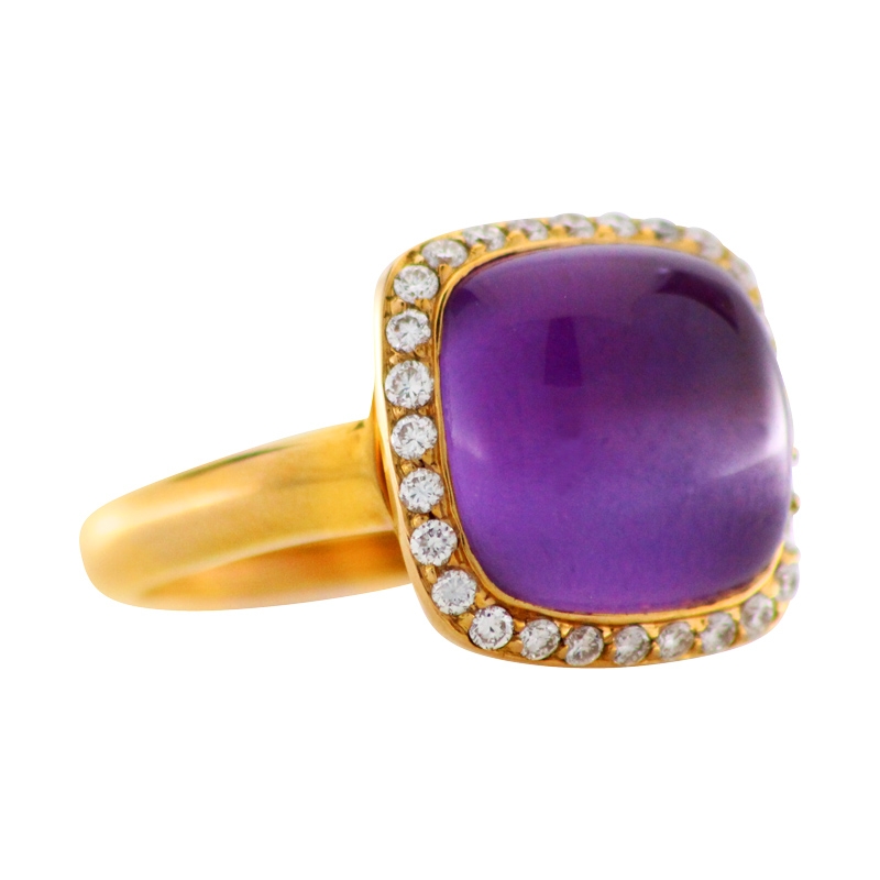 Extravaganter Ring aus 750er Rotgold mit einem hell-violetten leuchtenden Amethyst-Cabochon, sowie mehreren funkelnden weißen Brillanten.