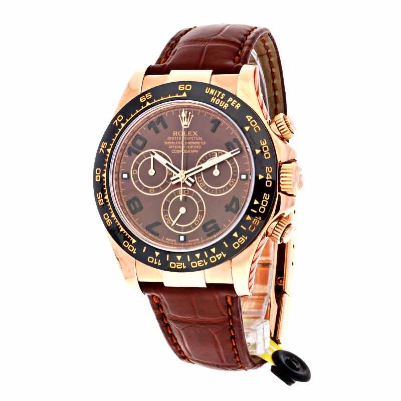 Gehäuse Everose-Gold (Oyster, 40mm, Höhe 12mm) mit verschraubtem Gehäuseboden und verschraubter Aufzugskrone, sowie verschraubten Chronographen- Drücker. Schwarze feststehende Keramik-Lünette (Cerachrom) mit eingespritzter Tachymeter-Skalierung. Kratzfestes Safirglas.